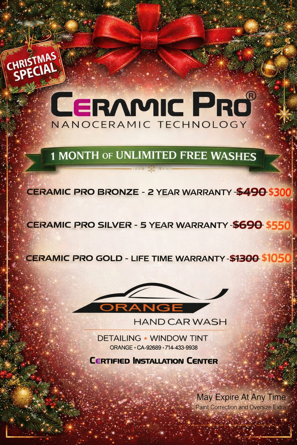Certificates have no cash value. Certificates expire 1 year from purchase. Any remaining balance will be left on certificate. Promotional discounted Gift Cards/Certificate can only be applied towards wash/detail/tint/dent services. Can't apply towards monthly/yearly memberships, wash booklets, other discounts or promotional offers.